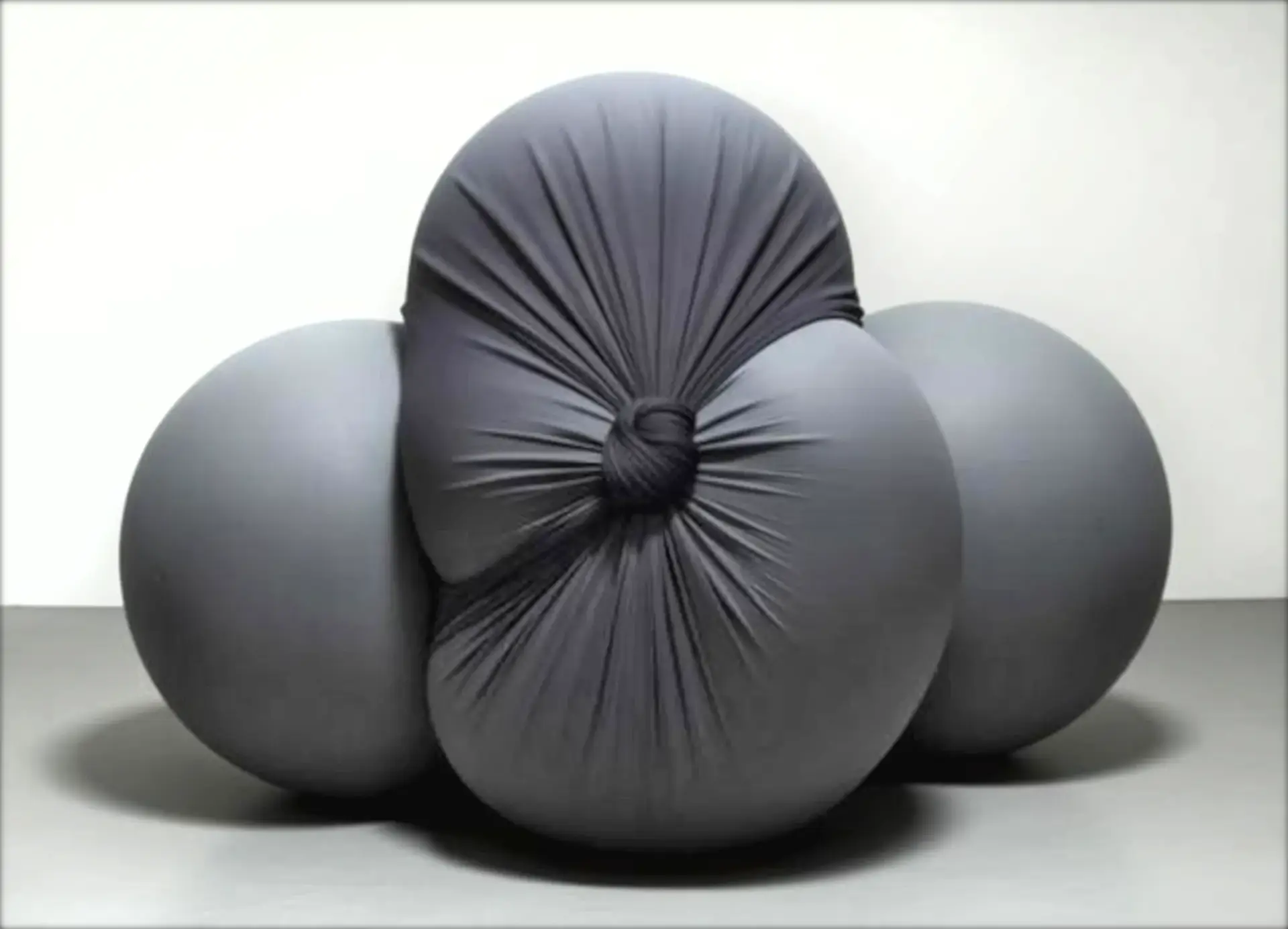 Stretch fabric (dark wool / elastic textile), internal structural frame, compressed fiber filling, industrial tension system. Installation scale: 180 × 240 × 180 cm