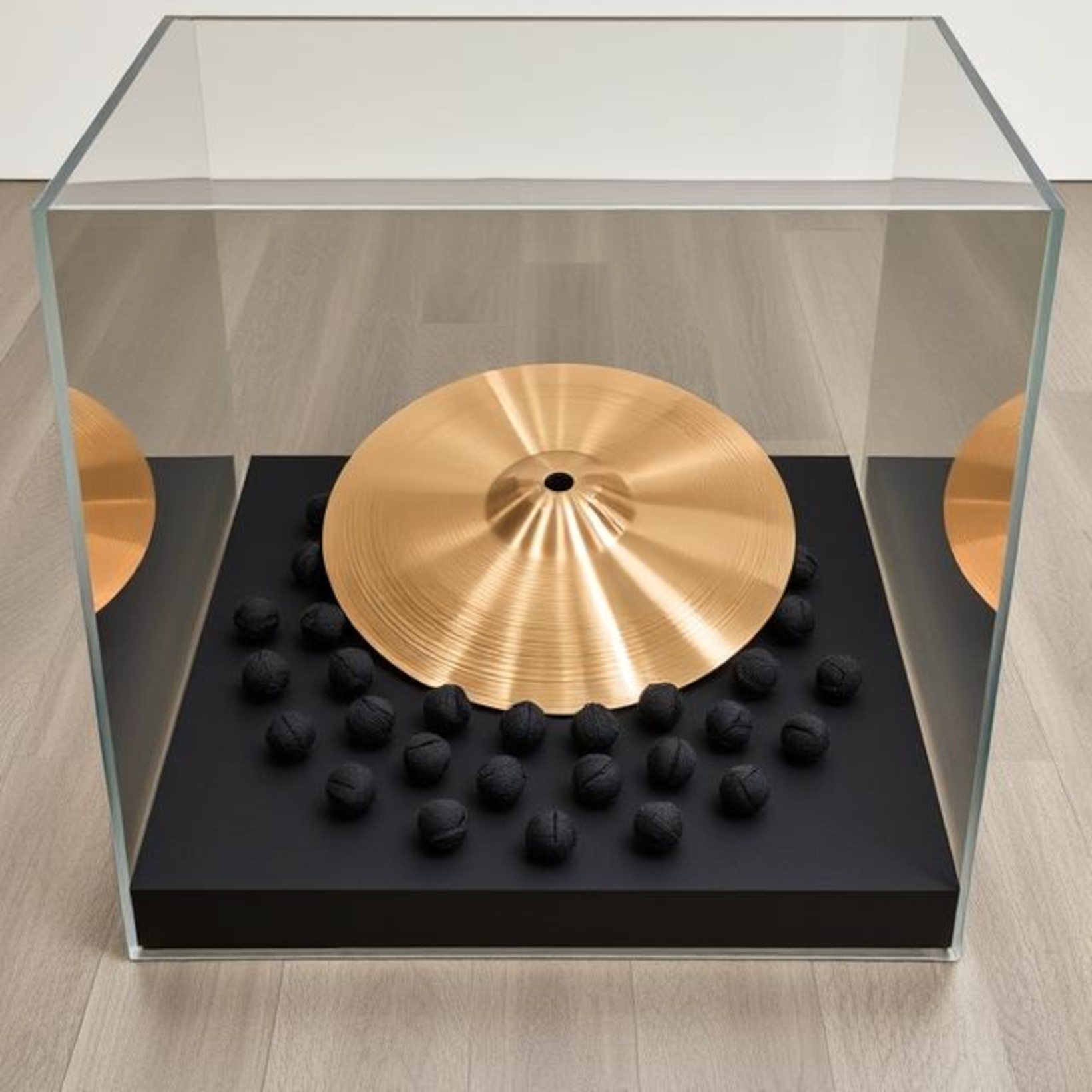 Cymbal, rope spheres, glass vitrine · 2025